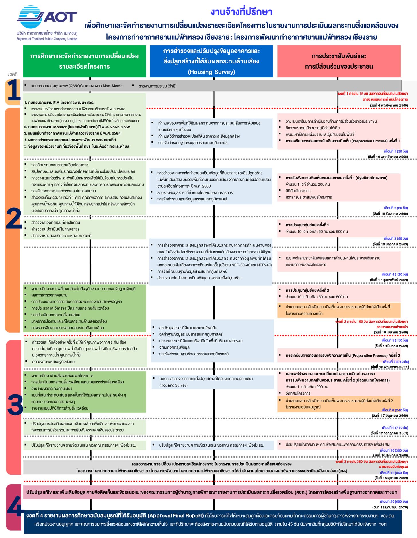 1.ศึกษาและทบทวนรายงานการประเมินผลกระทบสิ่งแวดล้อมโครงการท่าอากาศยานแม่ฟ้าหลวง เชียงราย และรายงานการติดตามตรวจสอบคุณภาพสิ่งแวดล้อม