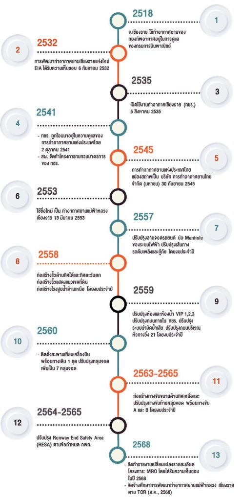 กำหนดแผนโครงการพัฒนา ท่าอากาศยานแม่ฟ้าหลวง เชียงราย ระยะที่ 1 ปี พ.ศ. 2568-2571 มีวัตถุประสงค์เพื่อเพิ่มปริมาณการจราจรทางอากาศ จากปัจจุบันสามารถรองรับผู้โดยสาร 3 ล้านคนต่อปี พัฒนาเพิ่มขีดความสามารถในการรองรับผู้โดยสารเป็น 6 ล้านคนต่อปี และแผนโครงการพัฒนาท่าอากาศยานแม่ฟ้าหลวง เชียงราย ระยะที่ 2 ปี พ.ศ. 2576-2578 เพื่อเพิ่มขีดความสามารถในการรองรับผู้โดยสารเป็น 8 ล้านคนต่อปี ในปี พ.ศ. 2578 ซึ่งสอดรับเป้าหมายของไทยในการเป็นศูนย์กลางการบินภูมิภาคลุ่มน้ำโขงตอนบน